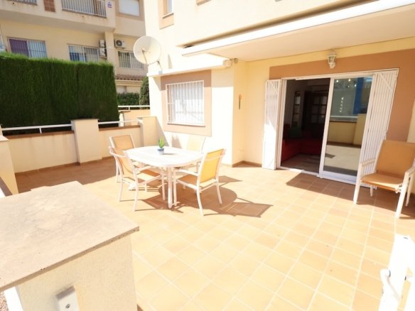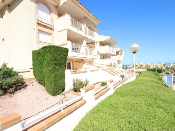 We present at the Costa Blanca Alicante a a downstairs apartment in Aqua Marina Campo Amor Orihuela Costa with seaview and close tho the swimmingpool! This flat have a large terrace with entrance to the pool, 2 bedrooms, a bathroom and a wide equiped kitchen with entrance to the patio! A closed garage is included! Close to al services and a few steps to the beach!