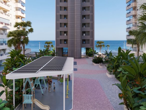 Azure Icons by TM is located on the beachfront of La Fossa Beach in Calpe, with two pedestrian access points: one from Avenida Juan Carlos I and the other from the La Fossa Beach promenade. The development comprises a total of 72 homes with 1, 2, and 3-bedroom apartments and 3-bedroom duplex penthouses with solariums.