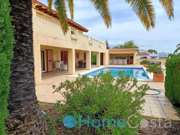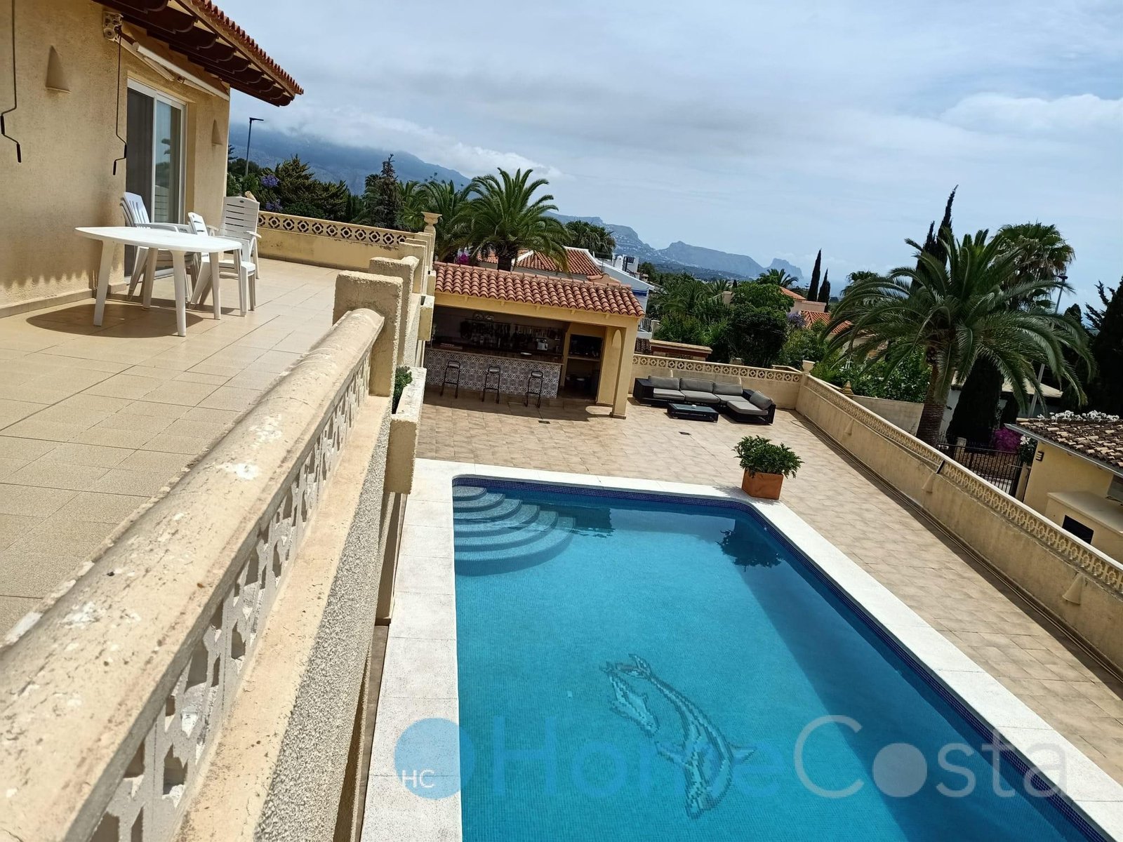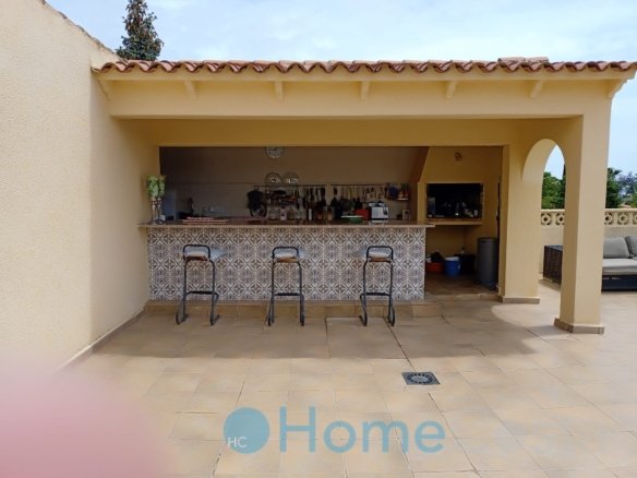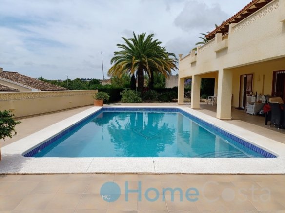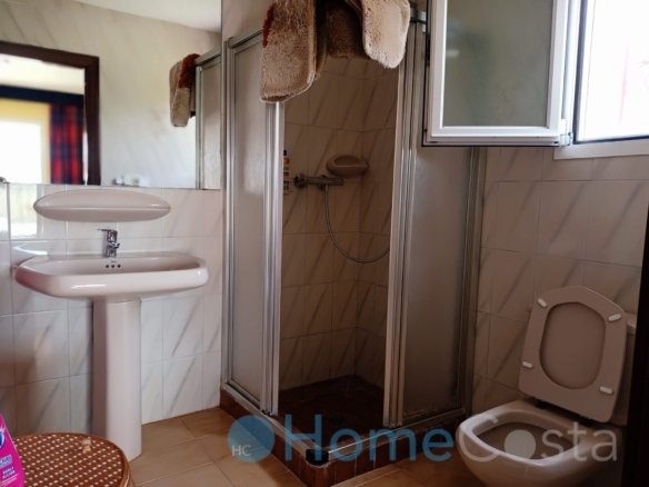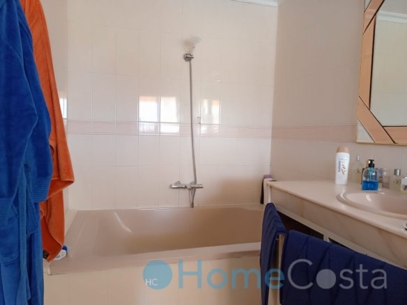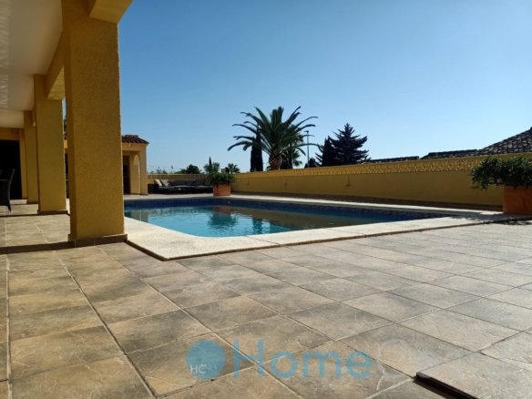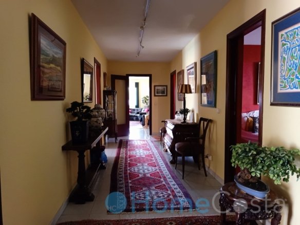 This grand villa has five bedrooms and four bathrooms. Four bedrooms on groundfloor plus three bathrooms and a livingroom. The livingroom and two bedrooms with ensuite bathrooms have direct acces to terrace and garden and view at the pool. The pool is 10 x 5 meter and 2.5 meter deep, so save to dive into. The hallway on groundfloor is wide and spacious as goes for the stairway up to first floor. One can enter