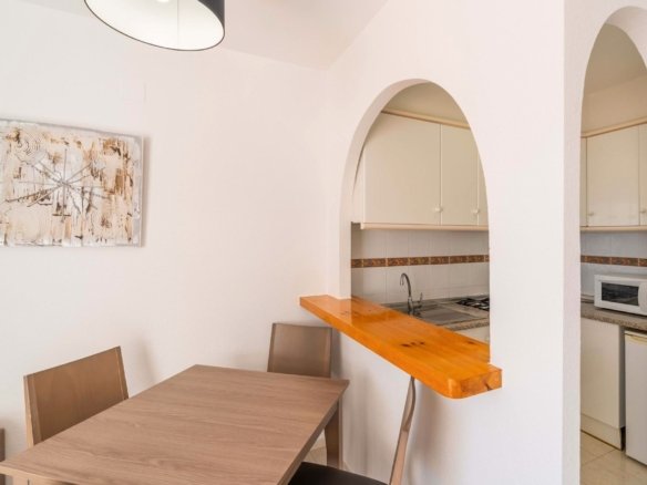 Introducing this residence: a well-presented property that blends practicality with a welcoming feel. Enjoy spectacular views of the Mediterranean Sea and the Peñón de Ifach from this quiet bungalow in Imperial Park, in Calpe. The house includes two fully equipped bedrooms with views of the Rock, a separate kitchen, bathroom, solarium, private parking space and a sunny living room, ideal for enjoying the sun and the Mediterranean atmosphere. The residential offers outdoor swimming pools for adults and children and large green areas, creating a perfect environment for family life and relaxation.