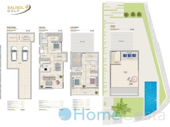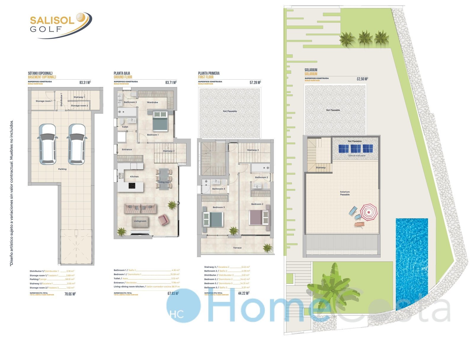 The villas have 141,5 m2 interior plus terraces of 27,5m2 and solarium of 52,5m2. Views of the