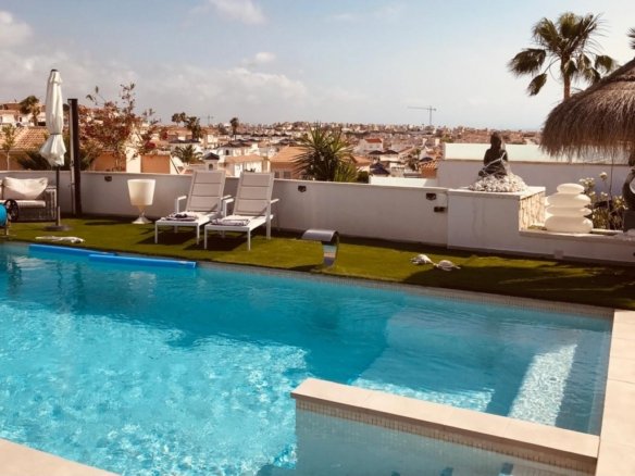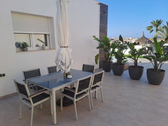 This beautiful modern build villa have also 2 apartments and a studio!Is in Ciudad Quesada and built on a plot of 1000 m² and consists of 3 buildings. The main building comprises a house with a 70m² living / dining room, open kitchen with island, 2 large bedrooms, and 2 en suite bathrooms, and a roof terrace of 120 m².